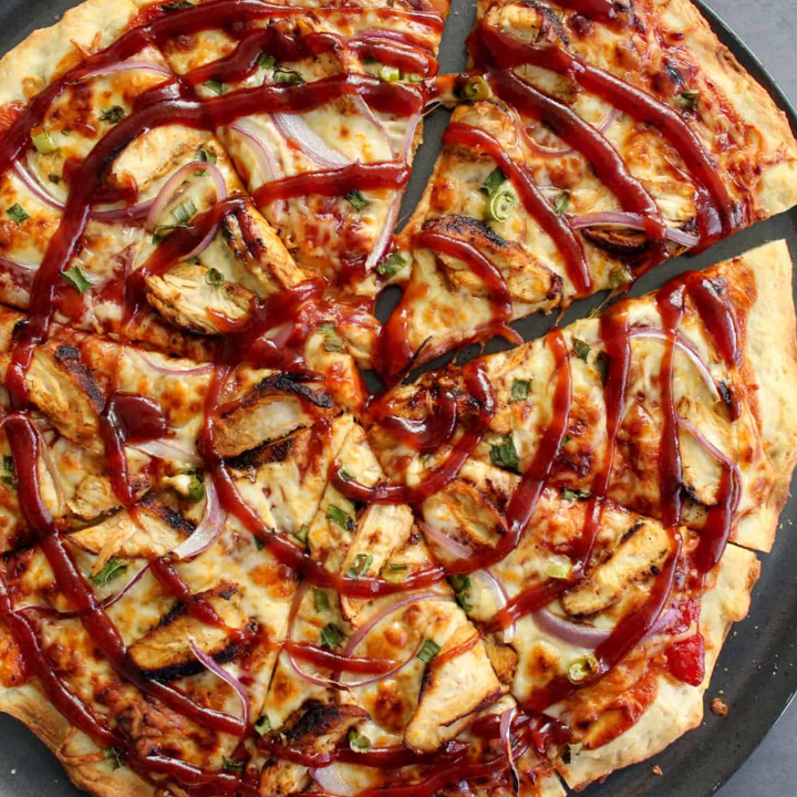 BARBECUE SAUCE, MOZZARELLA CHEESE, SHREDDED CHICKEN, RED ONION, BACON, BARBECUE SAUCE (DRIZZLE)
