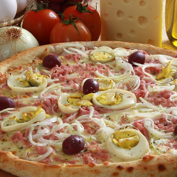 TOMATO SAUCE, MOZZARELLA CHEESE, HAM, BOILED EGG, ONION, BELL PEPPER, BLACK OLIVES, BACON