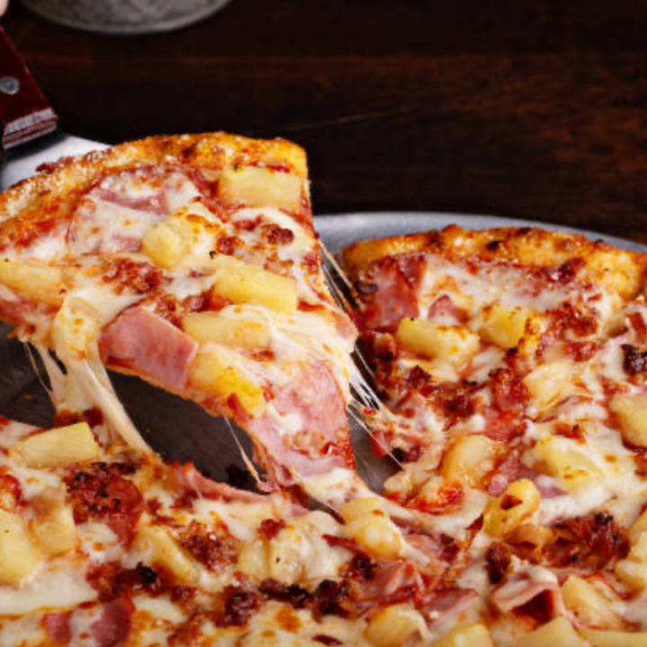TOMATO SAUCE, MOZZARELLA CHEESE, HAM, PINEAPPLE, BACON, RED ONION