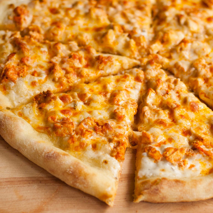 BUFFALO SAUCE, TOMATO SAUCE, MOZZARELLA CHEESE, SHREDDED CHICKEN SEASONED WITH BUFFALO SAUCE, RED ONION, RANCH DRESSING (DRIZZLE)