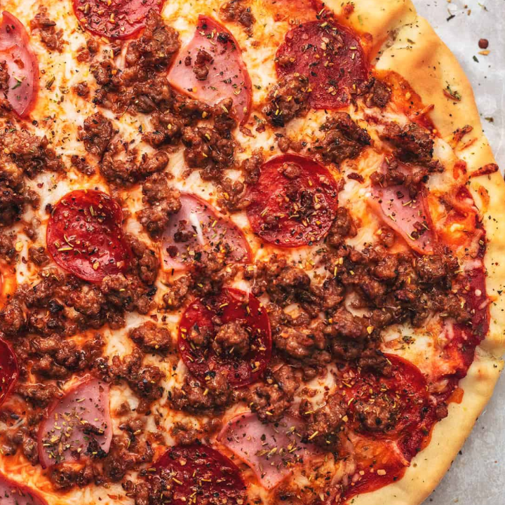 TOMATO SAUCE, MOZZARELLA CHEESE, PEPPERONI, ITALIAN SAUSAGE, HAM, BACON, GROUND BEEF